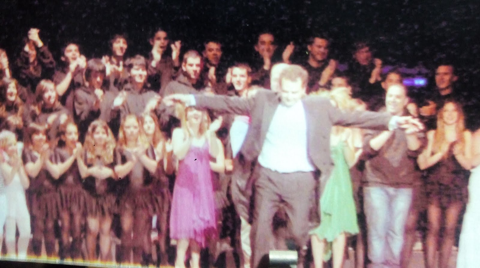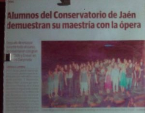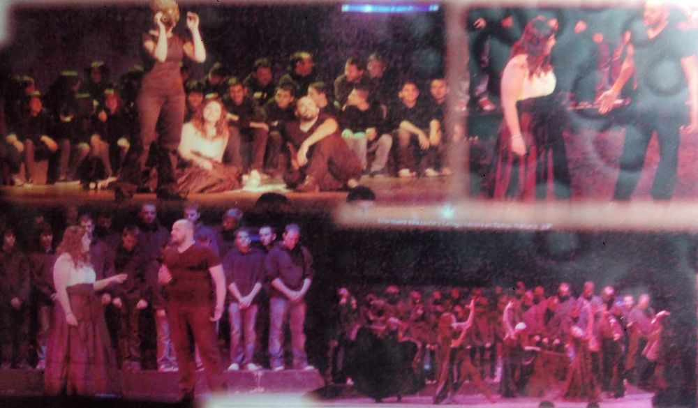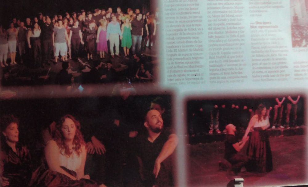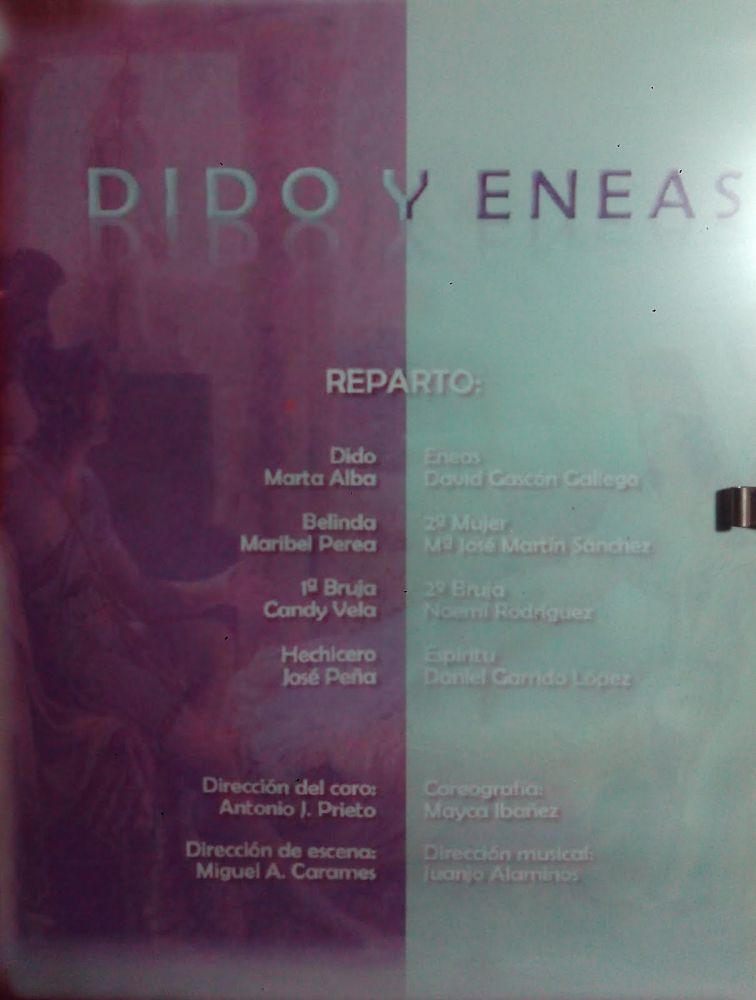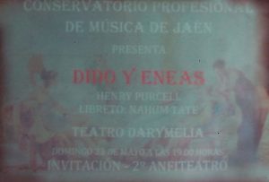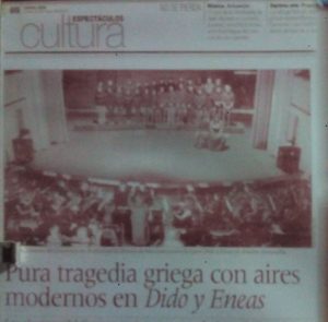 Comienza la función, teatro lleno y siento un pellizco en el estómago de nervios (Juanjo, el director de Orquesta, al que aprecio y un gran profesional e idealista de esta aventura,al que estaba habituado a ver en ropa no excesivamente formal sale con un traje impecable, momento en que me invadió la más absoluta de las responsabilidades), y es que el comienzo siempre impresiona…. entra el coro. 2º mujer (Marta Illescas) y Aeneas (yo) comentamos nuestras sensaciones y ella me ayuda con sus experimentadas palabras…. sale ella y estaba sonando todo muy bien… Belinda (Maribel Perea, Dido (Marta) y 2º Mujer (Marta)….. llega el momento de la entrada de Aeneas (yo) entro en escena saludo a la 2º mujer y Belinda me quita la chaqueta de cuero, momento en el que miro a público y pienso «ya no hay vuelta atrás, ¡¡¡hay que cantar con lo que tengas¡¡¡¡» momento de alta intensidad porque Aeneas tiene que jugar con Dido y enamorarse ambos…. ambos se clavan la mirada en un momento de música maravillosa y juegan por el escenario…. hasta que se van de escena mientras el coro y la danza